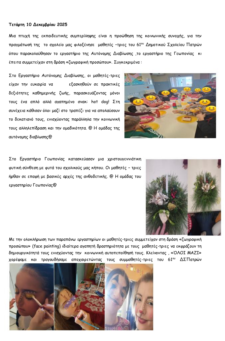 Στις 4 Δεκεμβρίου, με αφορμή την Παγκόσμια Ημέρα Ατόμων με Αναπηρία, το ΕΕΕΕΚ υποδέχθηκε σχολεία Γενικής Αγωγής στο πλαίσιο δράσεων που προάγουν τη συμπερίληψη, τη συνεργασία και την κοινωνικοποίηση των μαθητών. Μία από τις δράσεις που υλοποιήθηκαν ήταν η επαναχρησιμοποίηση υλικών και περιβαλλοντικής ευαισθητοποίησης. Πλαστικά δοχεία τροφίμων, που είχαν συγκεντρωθεί από ολόκληρη τη σχολική κοινότητα και προορίζονταν για απόρριψη, μετατράπηκαν από τους εκπαιδευτικούς και τους μαθητές του Εργαστηρίου Γεωπονίας σε λειτουργικά κασπώ. Τα κασπώ χρησιμοποιήθηκαν για τη δημιουργία χριστουγεννιάτικων φυτικών συνθέσεων, διακοσμημένων με φυσικά υλικά και παλιά χριστουγεννιάτικα στολίδια που επισκευάστηκαν και επαναχρησιμοποιήθηκαν. Οι συνθέσεις δημιουργήθηκαν από κοινού από μαθητές Γενικής και Ειδικής Αγωγής και προσφέρθηκαν στα φιλοξενούμενα σχολεία, ενισχύοντας το μήνυμα της συνεργασίας, της αποδοχής της διαφορετικότητας και της κοινής δημιουργίας. Η δράση υπηρετεί τους στόχους του Αειφόρου Σχολείου, καθώς: